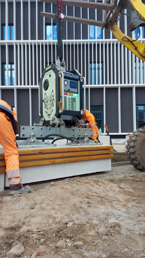 The Catchshift vacuum lifter, with a lifting capacity of up to 4000 kg (4 tons), allows for the transportation, lifting, and seamless laying of heavy concrete elements, floor slabs, and various products made from stone and concrete.”