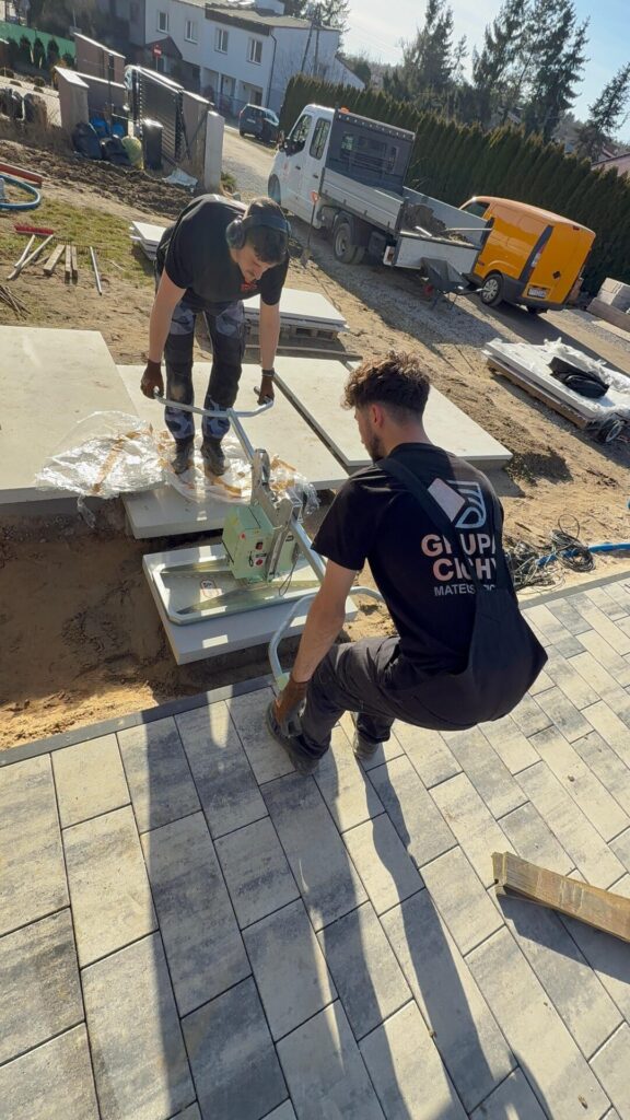 To właśnie przy takich realizacjach najlepiej widać, jak duże znaczenie ma dobrze dobrane urządzenie montażowe. Chwytak próżniowy nie tylko ułatwia transport elementu, ale również pomaga ekipie pracować dokładniej i pewniej podczas osadzania prefabrykatu.