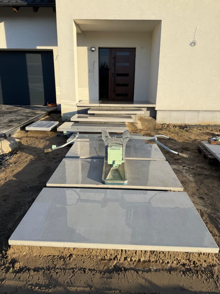 Zdjęcia z realizacji pokazują praktyczne zastosowanie chwytaka E-Mickey 255 przy montażu różnych elementów z betonu architektonicznego. W projekcie wykorzystano zarówno większe płyty 180 x 90, jak i elementy 90 x 60 oraz blok schodowy 100 x 40 x 15.